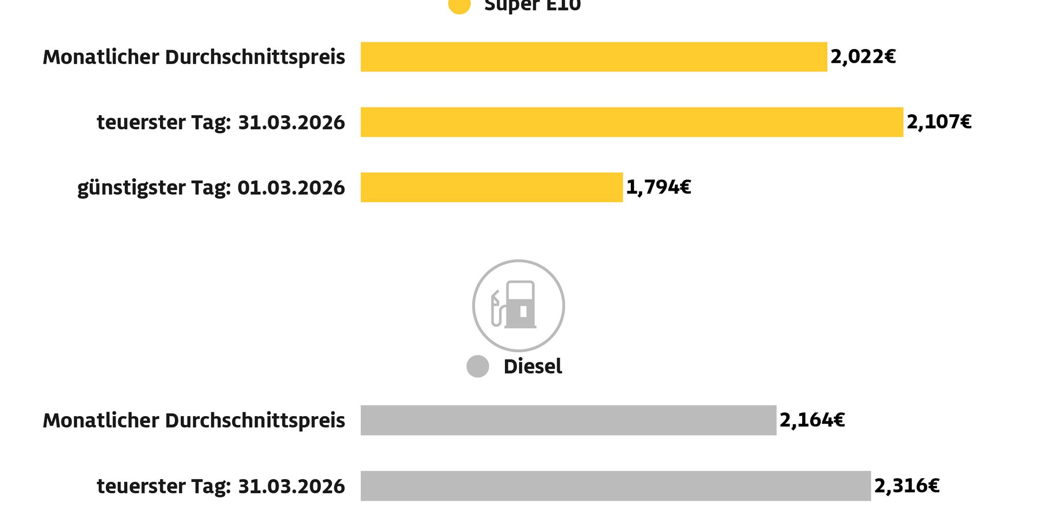 München (ots) – Die Kraftstoffpreise sind im März 2026 massiv gestiegen. Wie die aktuelle ADAC Auswertung der Kraftstoffpreise in Deutschland zeigt, kostete ein Liter Diesel im Monatsmittel 2,164 Euro – nie zuvor war Diesel im Monatsschnitt teurer! Teuerster Diesel-Monat aller Zeiten war bisher der März 2022, kurz nach Beginn des Ukraine-Kriegs, mit durchschnittlich 2,140 Euro. Auch Super E10 hat sich zuletzt sehr stark verteuert und kostete im März im Schnitt 2,022 Euro. Damit blieb der Preis zwar noch um 4,7 Cent unter dem des Rekordmonats März 2022, als für einen Liter Super E10 im Schnitt 2,069 zu bezahlen waren. Allerdings war der März damit für Super E10 der drittteuerste Monat aller Zeiten.