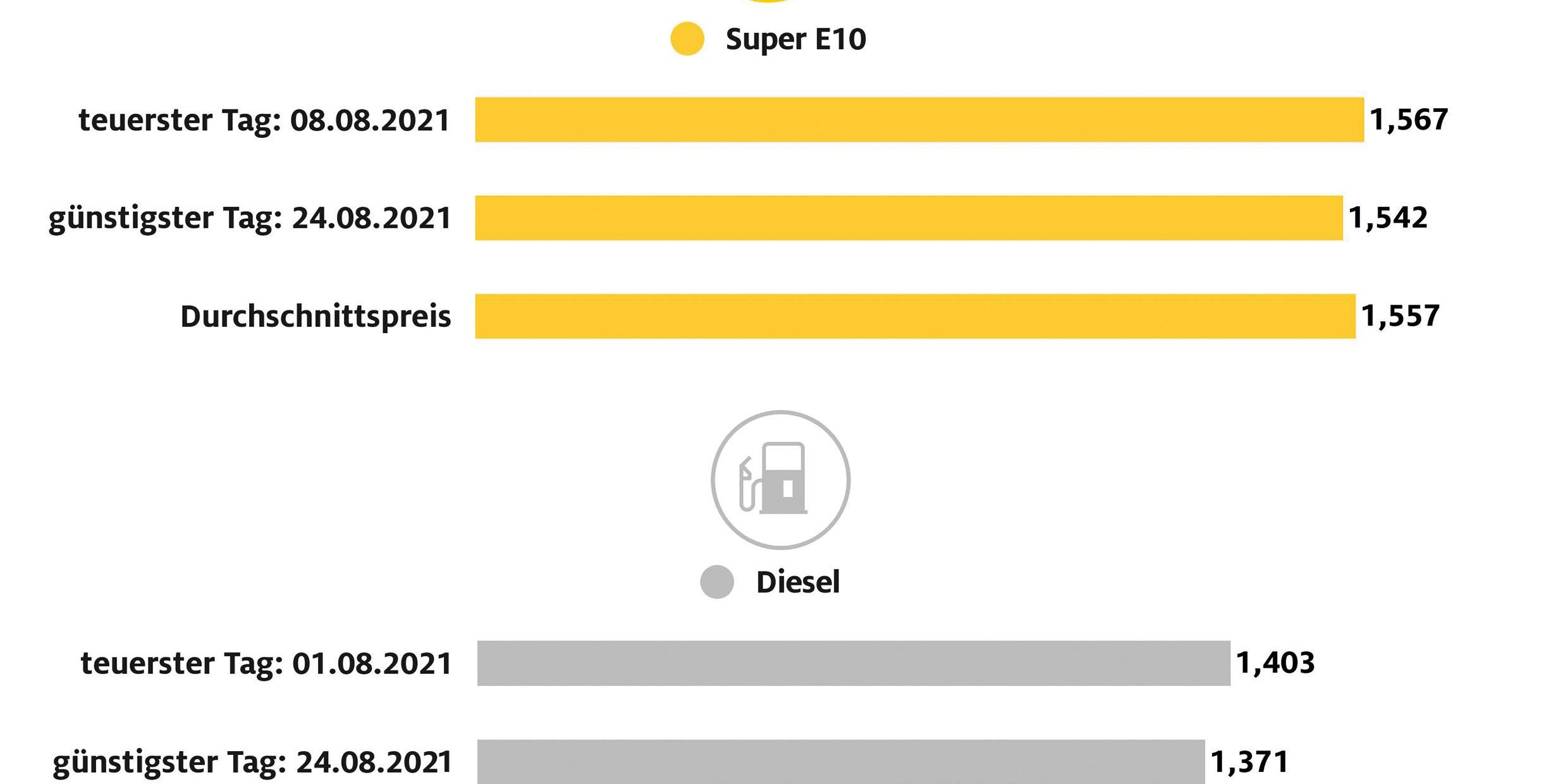 Teuerster Tag zum Tanken war bei Benzin der 8. August. Ein Liter kostete im Tagesmittel 1,567 Euro. Dieser Preis markierte gleichzeitig auch den vorläufigen Jahreshöchststand. Auch bei Diesel fielen teuerster Tag des Monats und des Jahres zusammen: Am 1. August mussten Diesel-Fahrer mit einem Literpreis von 1,403 Euro einen neuen Jahresrekord hinnehmen.